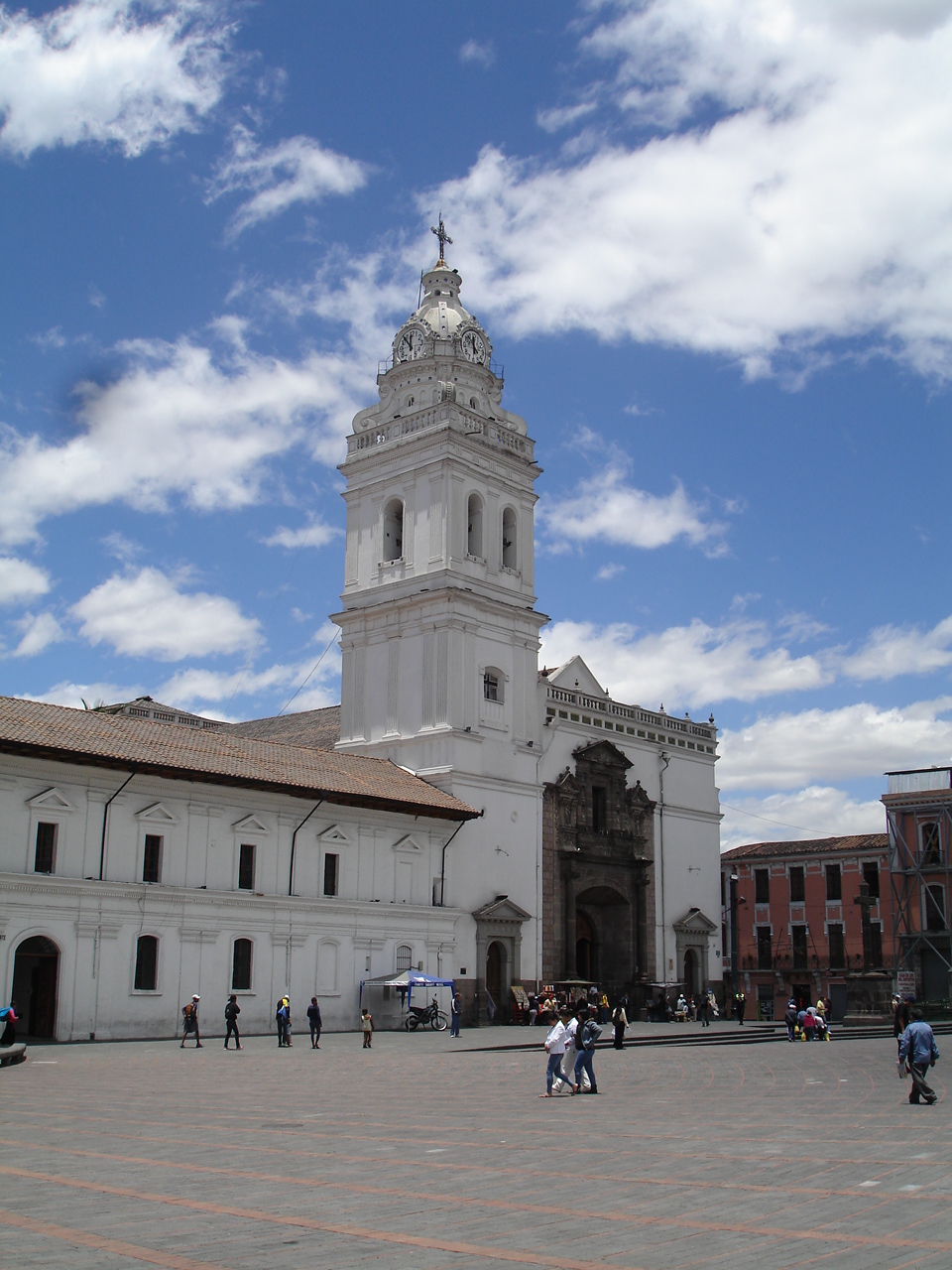 Locals waiting on the steps of the Cathedral on the Plaza San Francisco in old Quito.